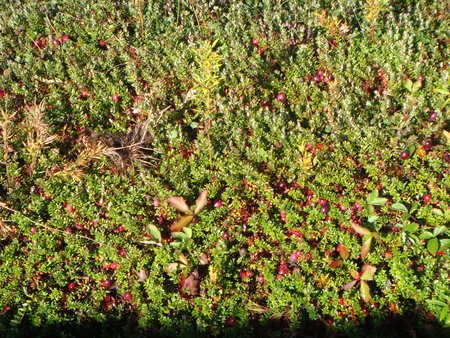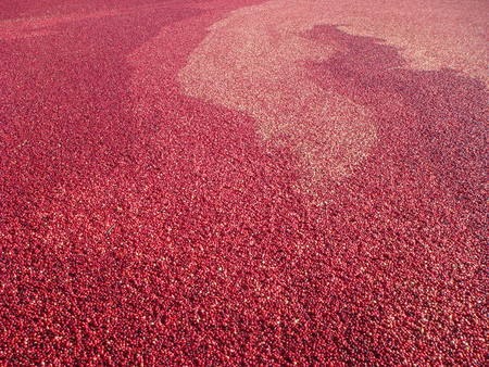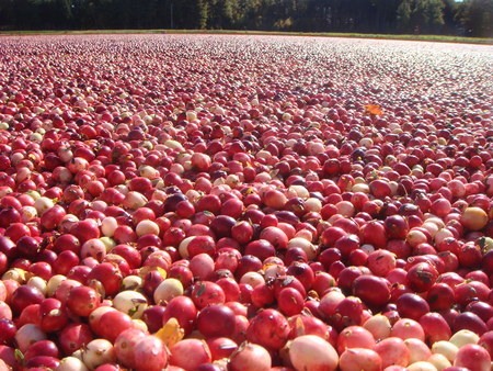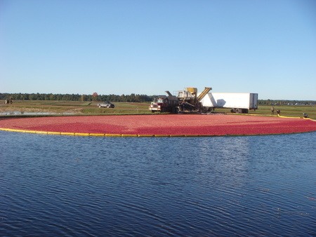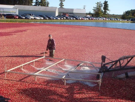 クランベリー畑に水を入れて、浮いてきた実を集めて収穫してました。