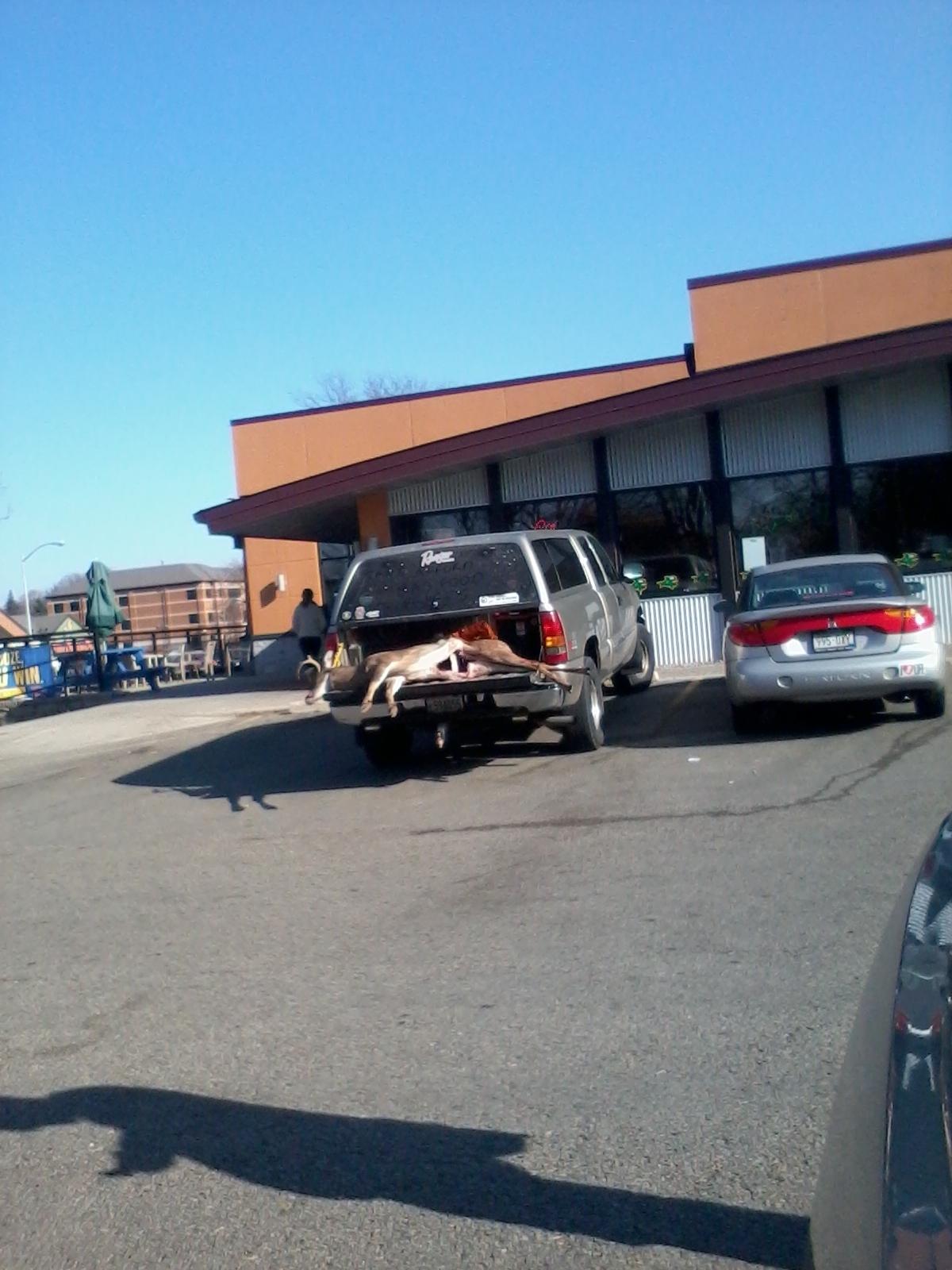 今日は宿題をしにStarbucks cafeへ行ったらすんごーいモノを発見!!見えるかな?鹿の亡骸がトラックに積んでありました。これは剥製にするのか、それとも食べるのだろうか?