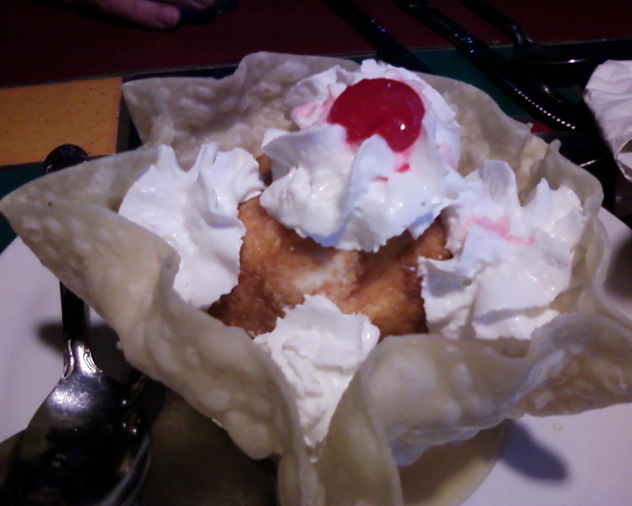 これはフライドアイスクリーム!!アイスをフライにしてるそうです。初めて食べたけど美味しかった~ おそらく、バニラアイスの回りにココナッツをまぶしてフライにし、シナモンをかけていると思われます。