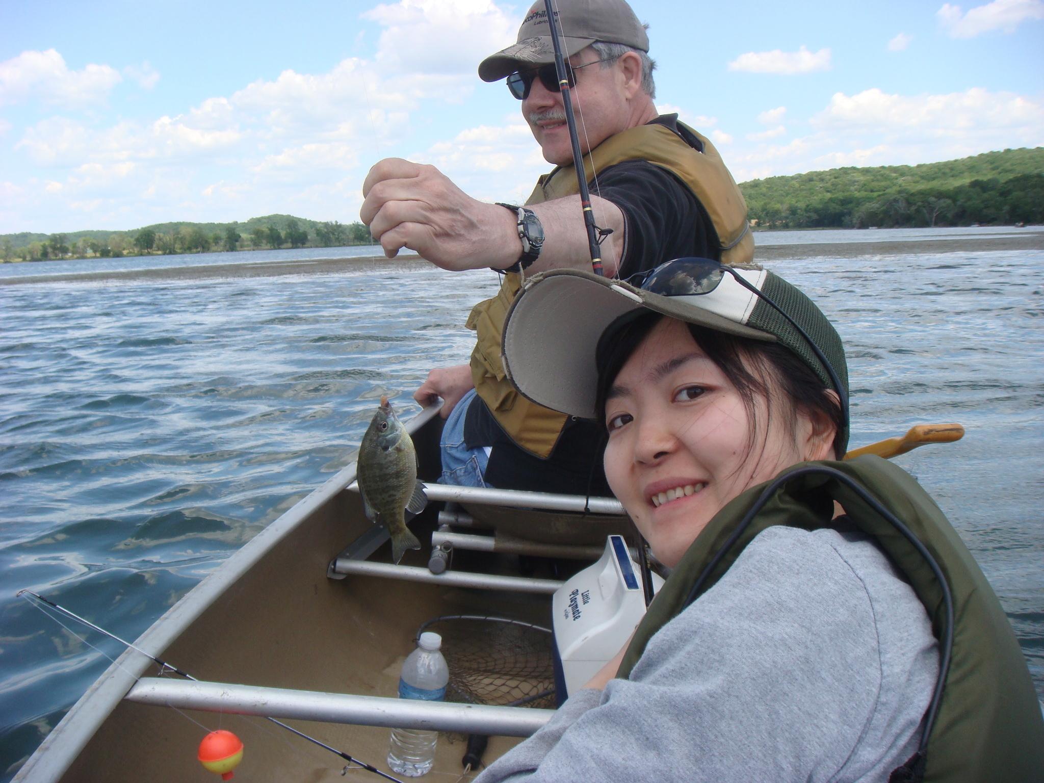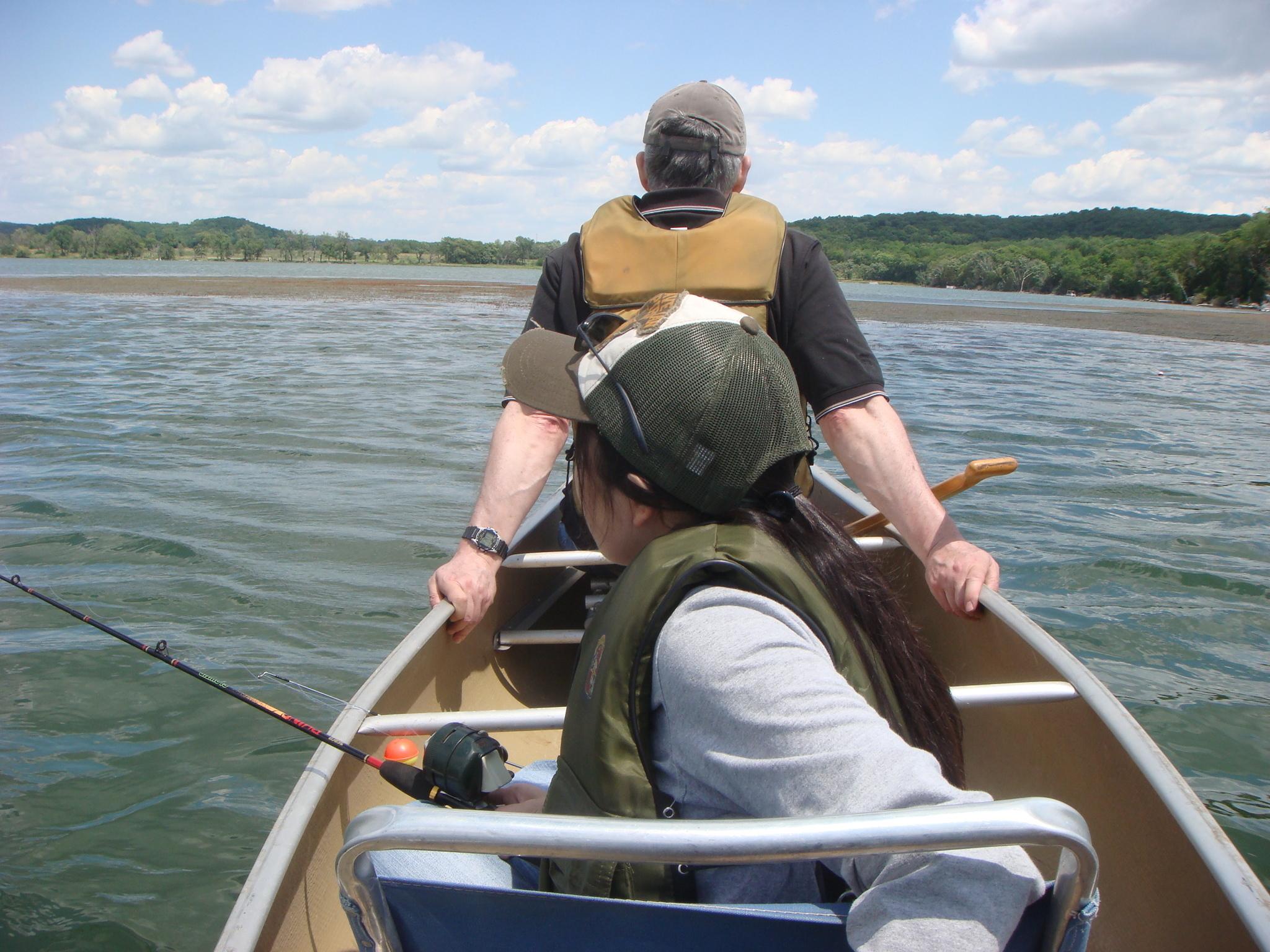 持参したカヌーは3人乗りだったようなので、旦那の父、私、旦那の3人で乗り込み、魚が釣れそうなスポットを探して釣り開始!(この間、旦那の母は車で読書)