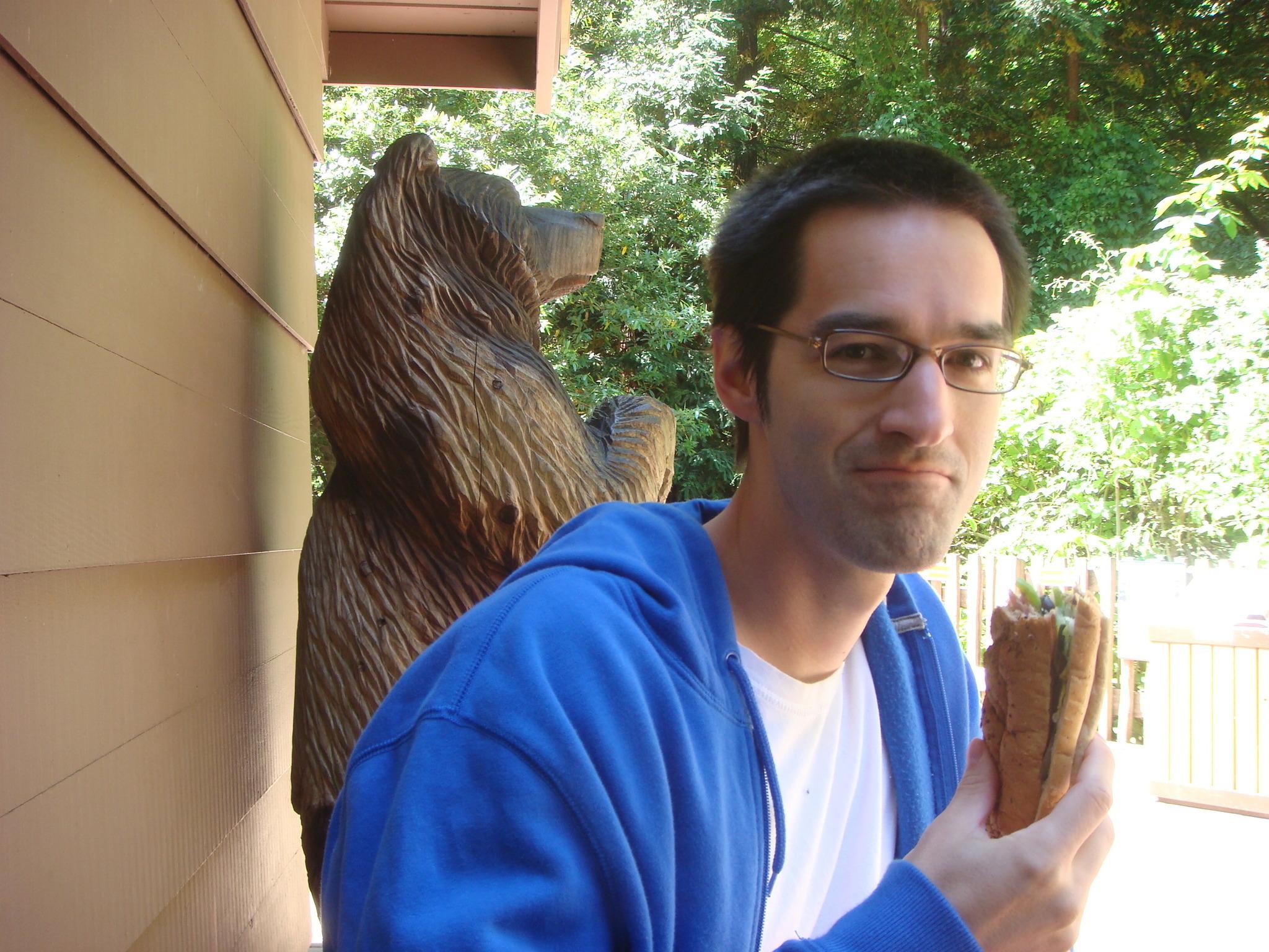 山を登った後は、サンドウィッチを食べながら熊の彫刻と記念撮影