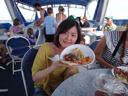 今日はお友達の誕生日を祝いを船の上でしてきました。こっちに来て初のクルージング!!ビール&ピザを頂いたよ~