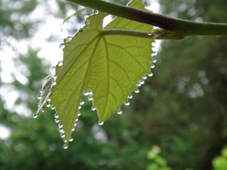 庭にある葡萄の木の葉に水滴がついていて綺麗~