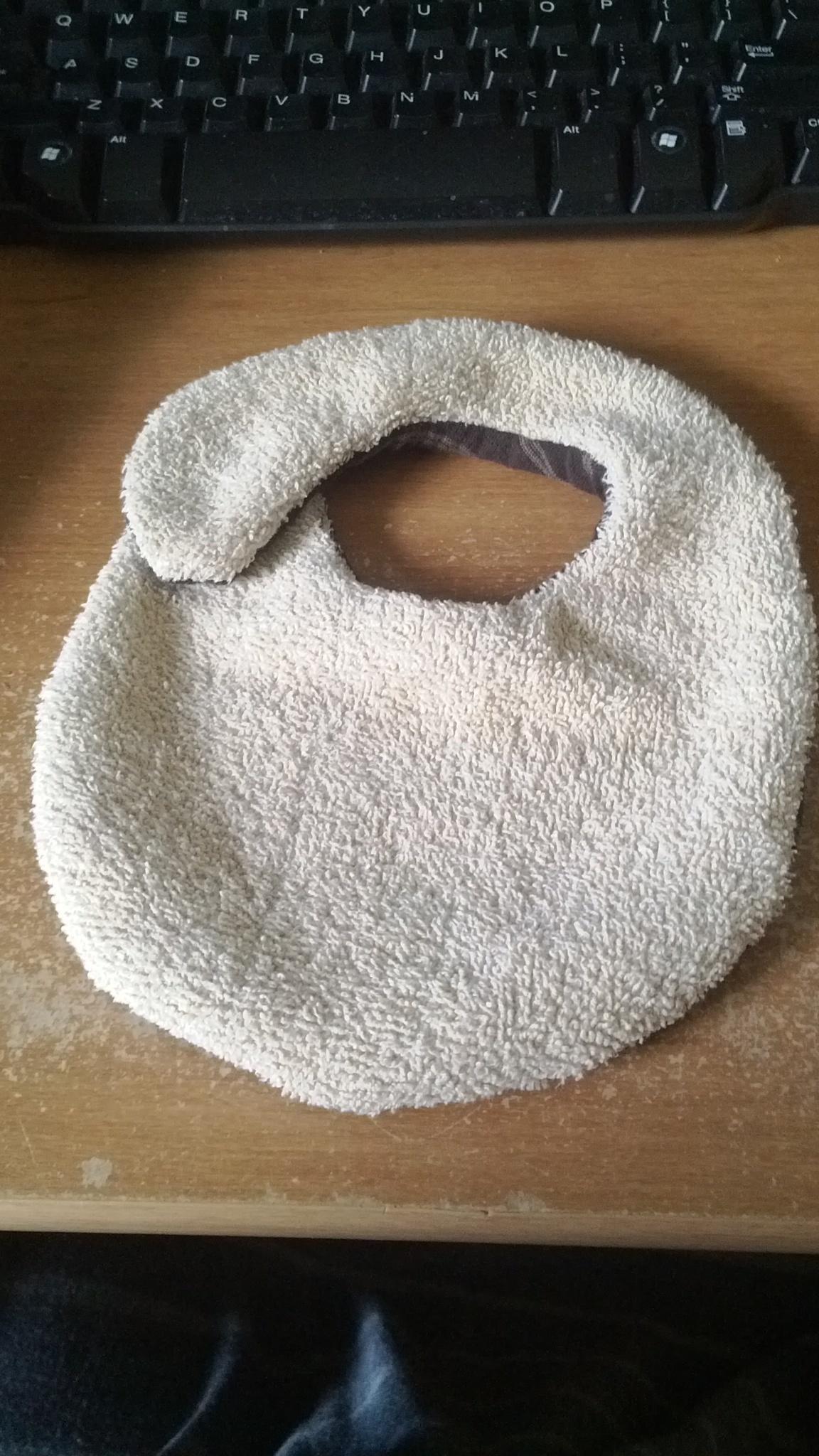 今日は、使い古したバスタオルと旦那さんのTシャツでベビースタイ(よだれかけ)を作ってみたよ。見た目はビミョーだけどエコだし汚れたら捨てられるのでいいかな~