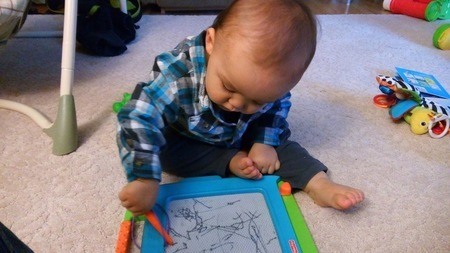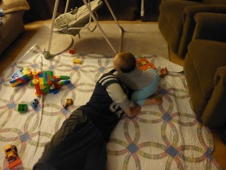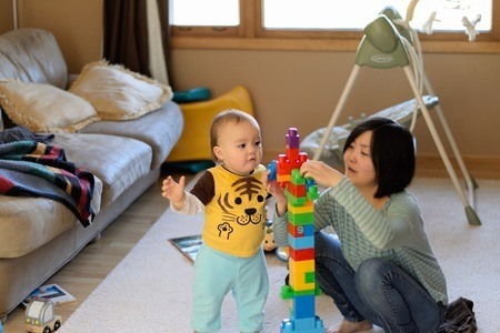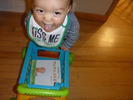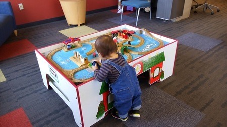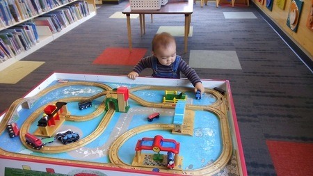 今日も図書館で遊ばせてきた。最初は女の子がいて一緒に遊んでくれていたけど、帰ってしまったので、ひとりで遊ぶ息子。