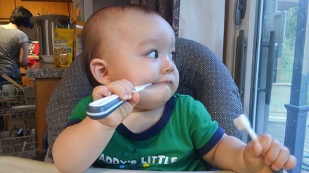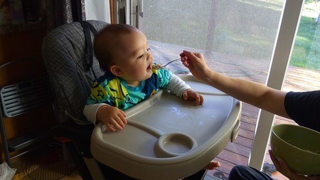 曾お婆ちゃんにお昼ご飯を作ってもらって、アンティークのハイチェアーでお食事〜