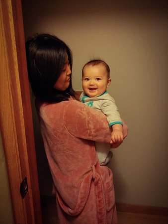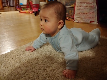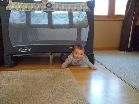 昨日、やっと寝返りをうてるようになりました!残念ながら動画に撮れなかった。今朝は寝返りの後にうつ伏せの状態で後ろに進み、気が付いたらpack n playの下に入ってました(笑)