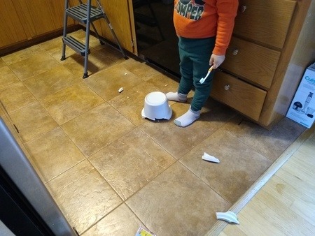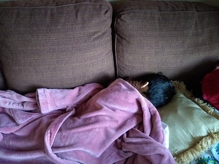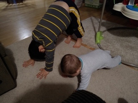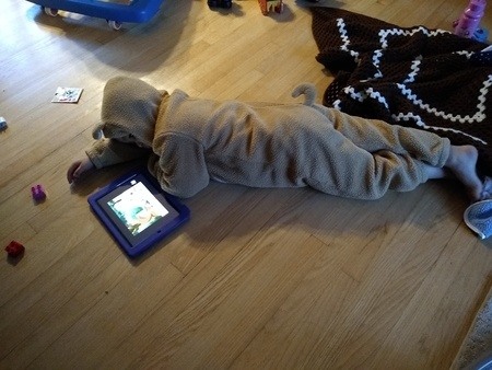 火曜日の夜にお腹が痛いと言ってきてから、下痢と嘔吐。今日もお昼ご飯の後にもどしてしまい、仕方なく布団で一日過ごさせる事に。お昼寝出来なかったため、疲れ切っていて床で大好きなiPad。早く良くなれ〜